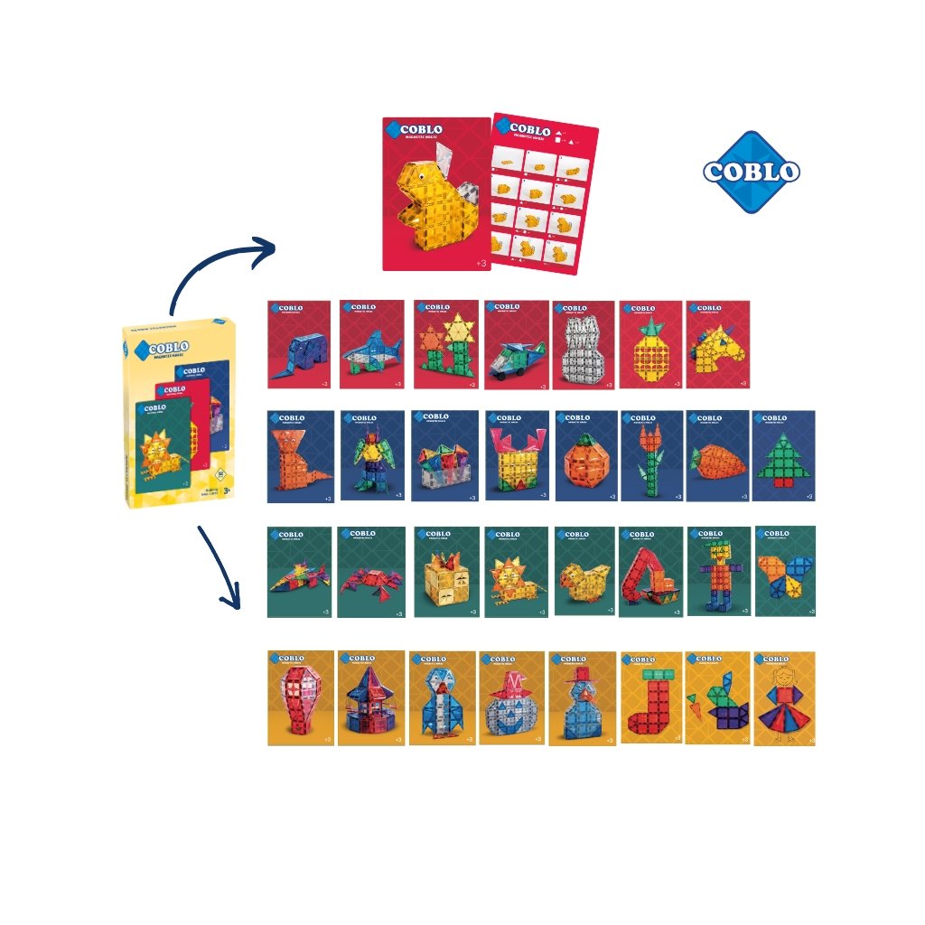 Pomocí těchto stavebních karet se děti hravou formou seznamují s vzdělávacími tématy s Coblo. Děti si musí obrázek pečlivě prohlédnout a poté ho znovu vytvořit. To trénuje jejich vizuální paměť, stejně jako schopnost rozpoznávat a prostorově umisťovat tvary, barvy a vzory. Navíc napodobování mapy vyžaduje pozornost a soustředění. Děti se učí plnit úkoly krok za krokem a zažívají úspěch, když se jim podaří obrázek zopakovat, což posiluje jejich sebevědomí.