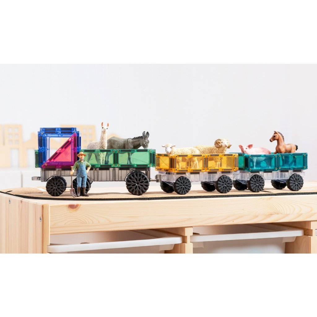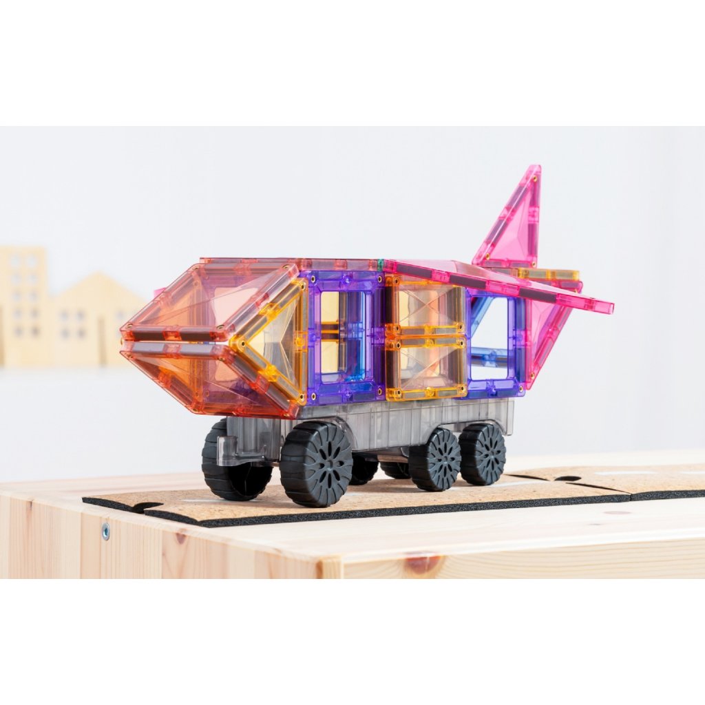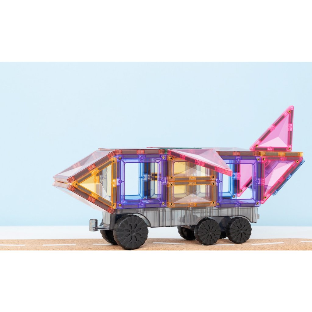 - Rozmanité dílky – sada obsahuje 1 velkou základnu pro vlak nebo kamion, 2 menší podvozky s gumovými koly a různé tvary magnetických dlaždic, včetně trojúhelníků, čtverců, obdélníků a okenních dílků. To umožňuje stavbu různých vozidel a struktur.