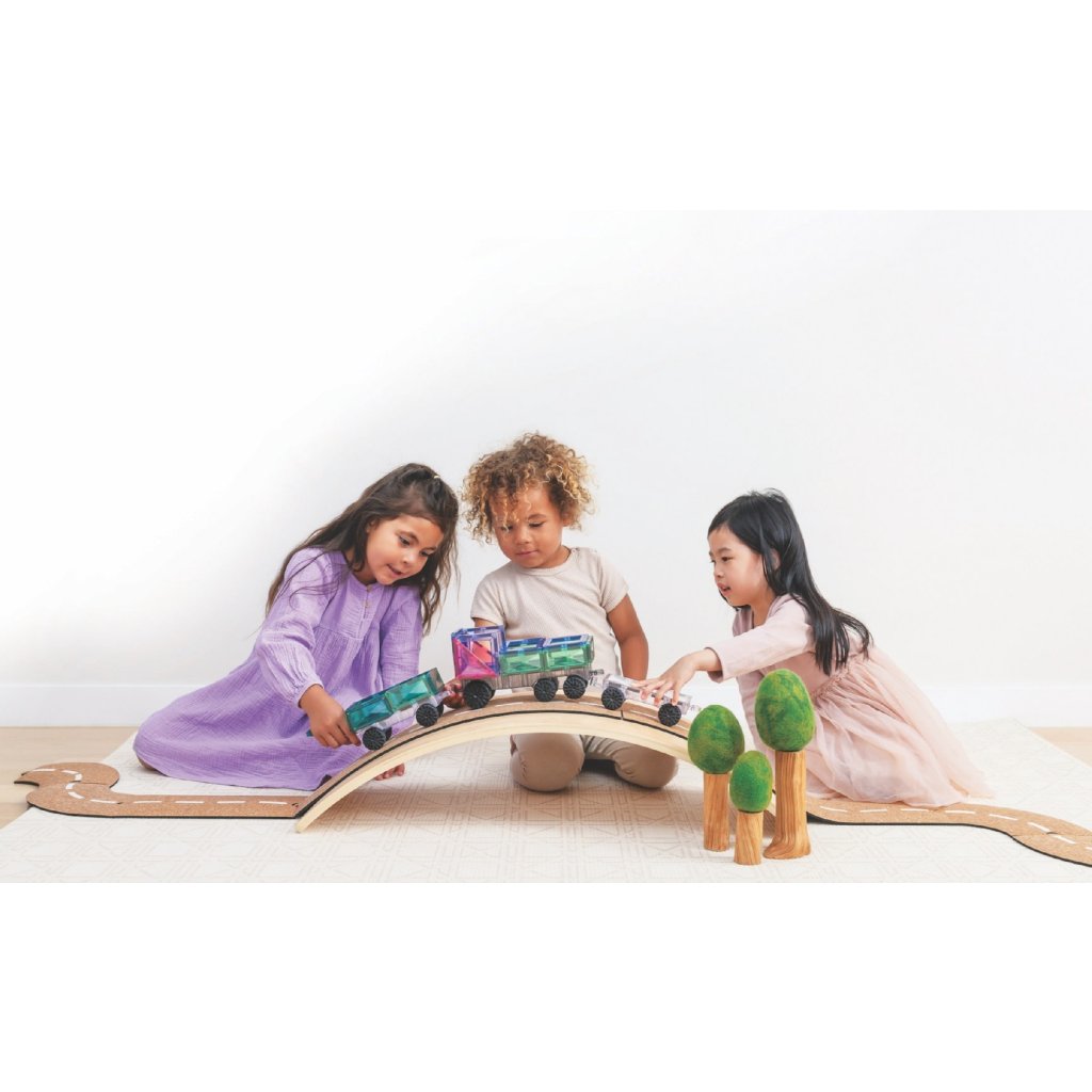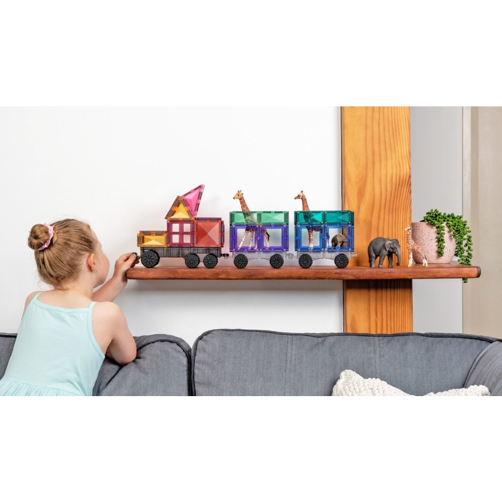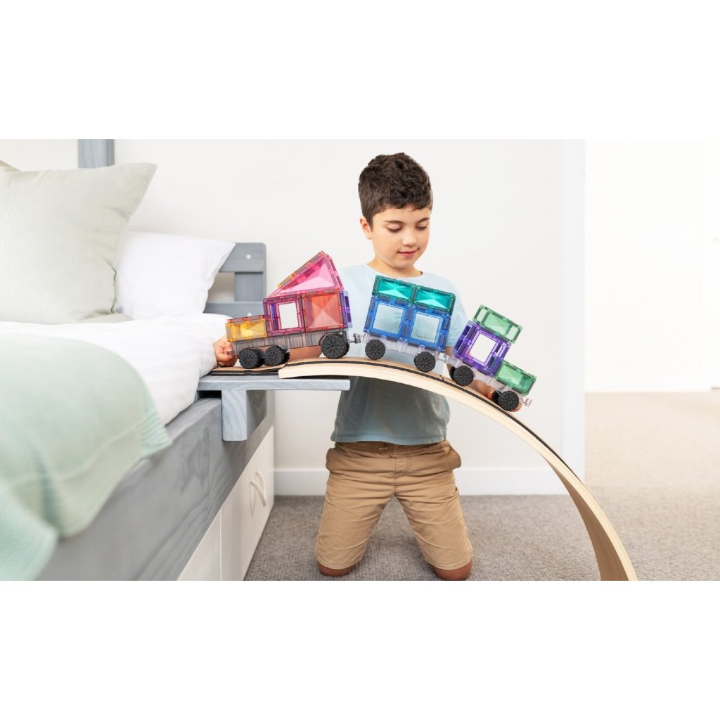 - Rozmanité dílky – sada obsahuje 1 velkou základnu pro vlak nebo kamion, 2 menší podvozky s gumovými koly a různé tvary magnetických dlaždic, včetně trojúhelníků, čtverců, obdélníků a okenních dílků. To umožňuje stavbu různých vozidel a struktur.