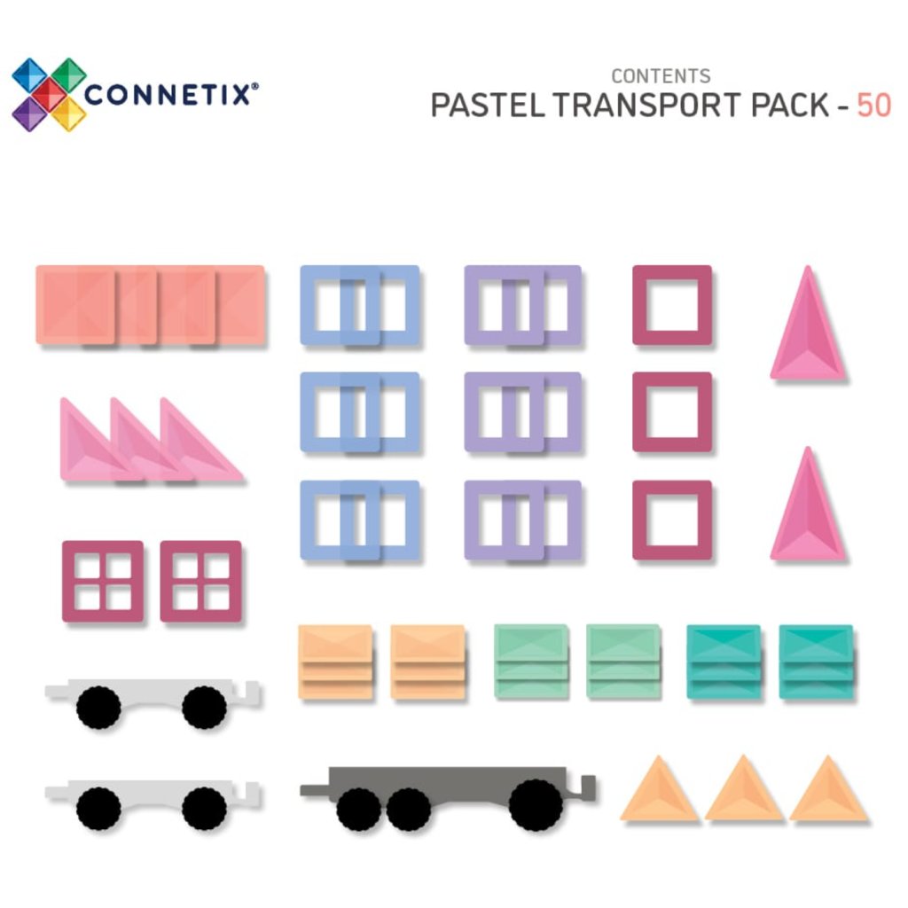 Objevte Connetix - Magnetickou stavebnici Pastel Transport Pack (50 dílků), ideální sadu pro malé stavitele a milovníky vozidel. Tato sada obsahuje 1 velkou základnu pro vlak či kamion, 2 menší podvozky s gumovými koly a různé pastelově zbarvené magnetické dílky, které dětem umožňují vytvářet rozmanité dopravní prostředky a podporují jejich kreativitu a prostorové myšlení.