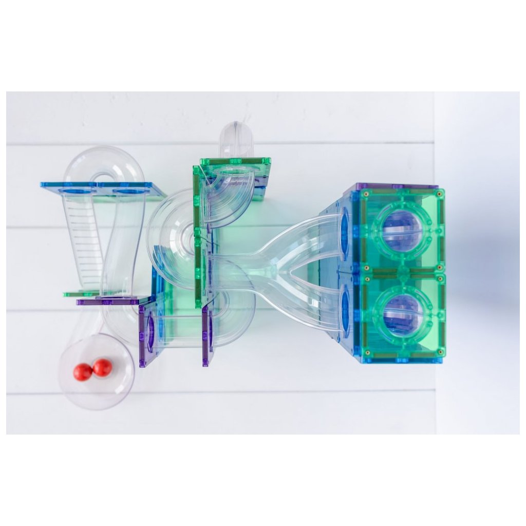 - Kvalitní materiál – vyrobeno z netoxického ABS plastu bez BPA a ftalátů; dílky jsou odolné proti poškrábání a díky průhlednému designu umožňují sledovat pohyb kuliček uvnitř tunelů.