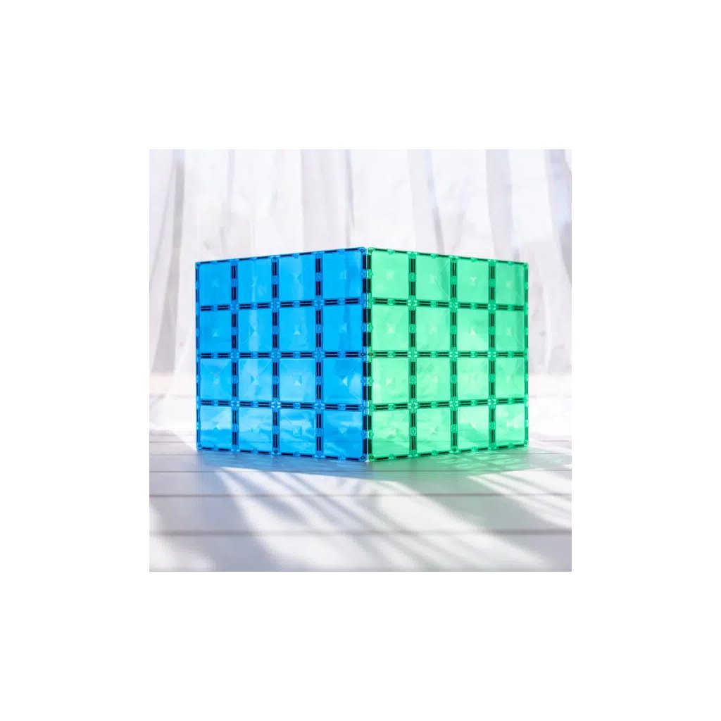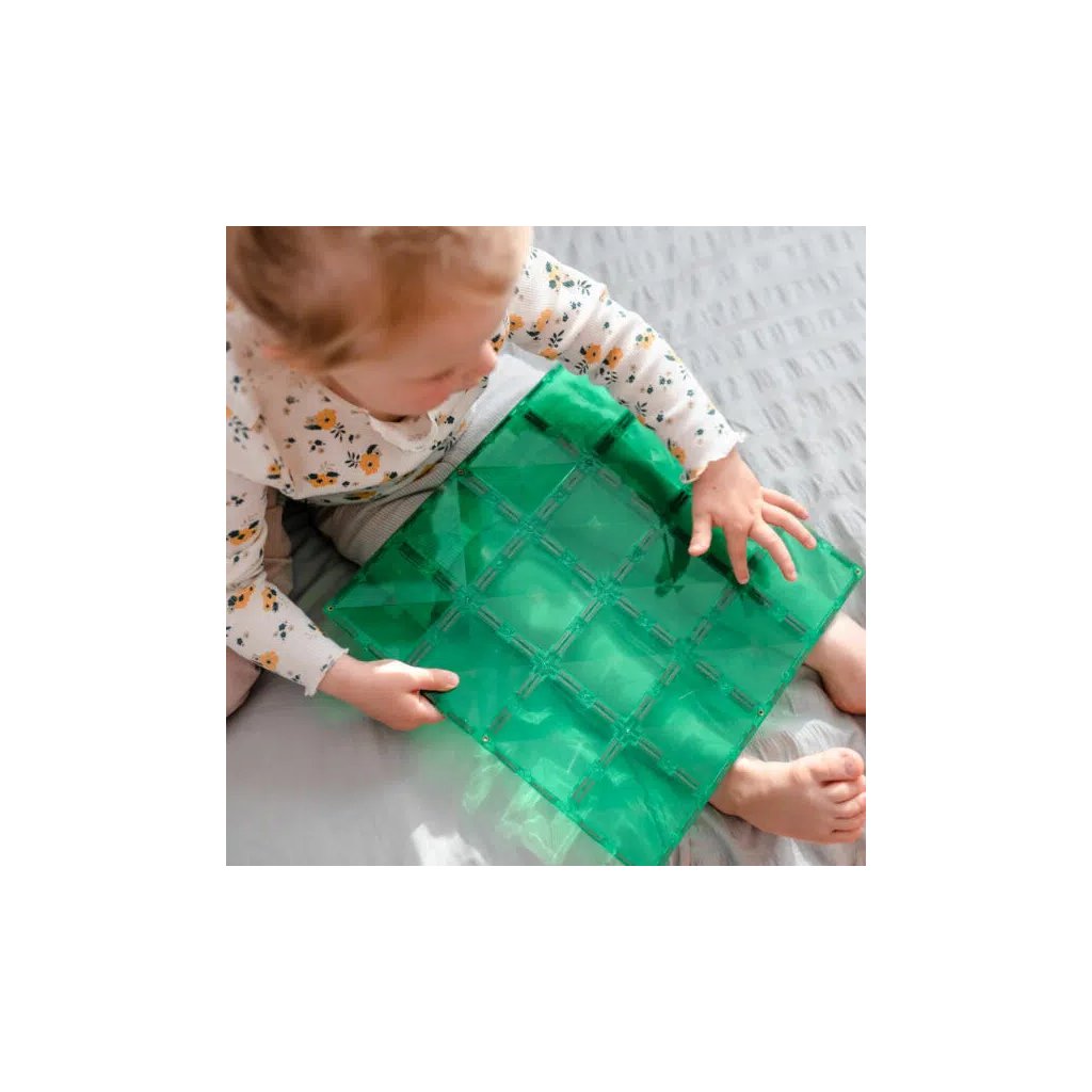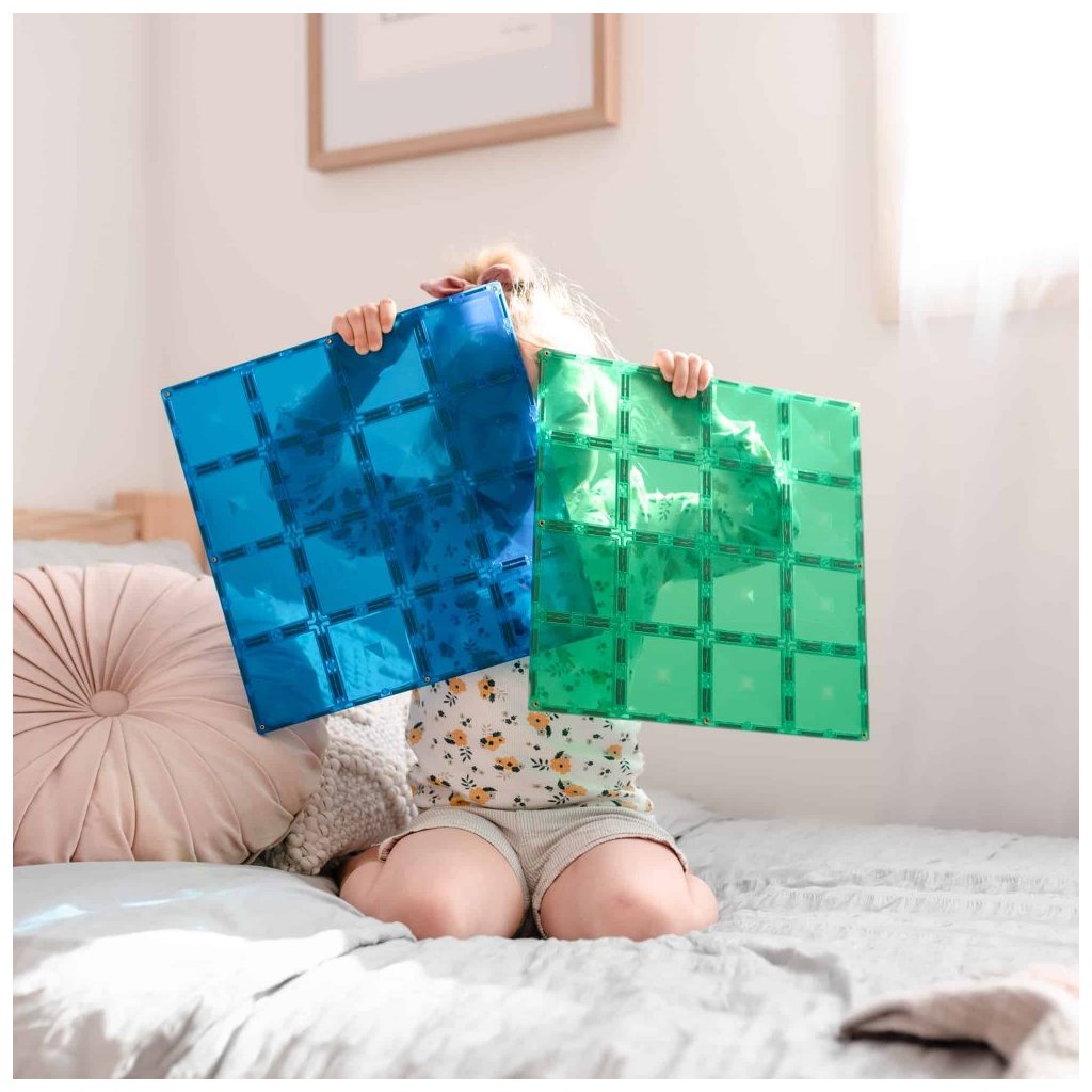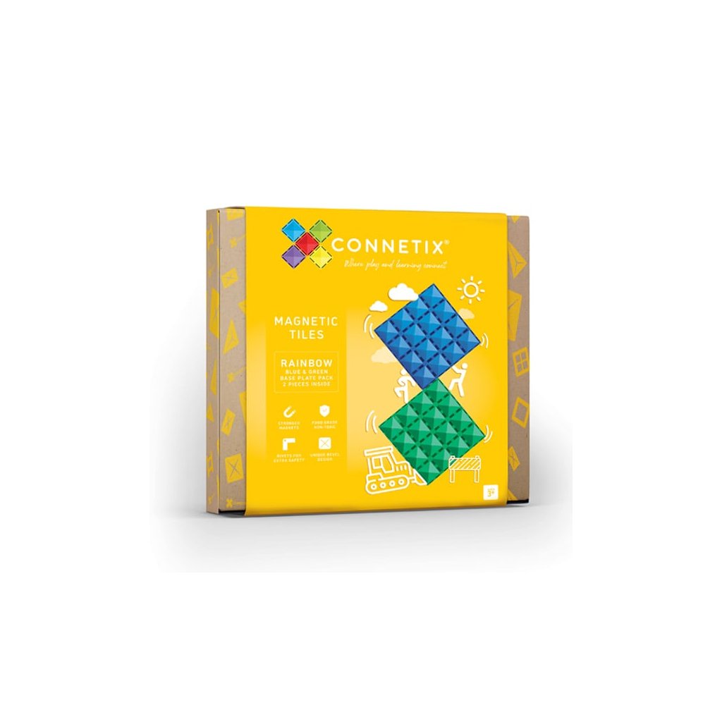 Obohaťte své stavebnicové sady s Connetix – Magnetickou základnou (2 díly) v modré a zelené barvě.