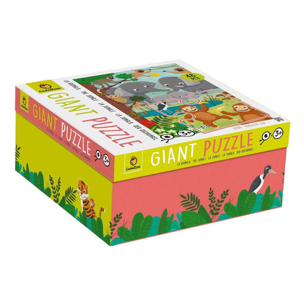 Nádherně ilustrované puzzle obří podlahové puzzle - Veselá džungle, které sestavíte ze 48 velkých pevných dílů. Výsledný obrázek má metr na šířku a 70 cm na výšku. Zabaví nejen děti, ale i dospělé. Vyrábí italská značka Ludaticca.