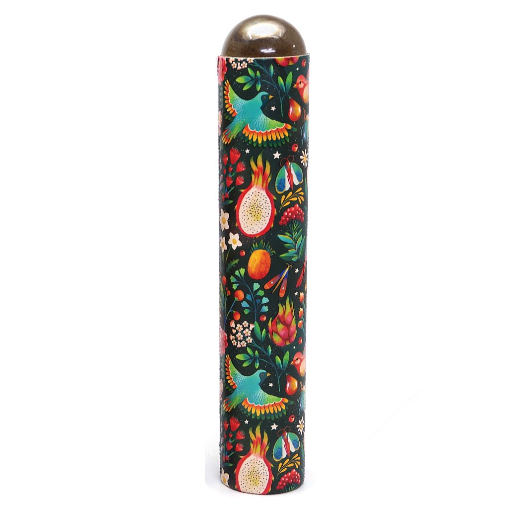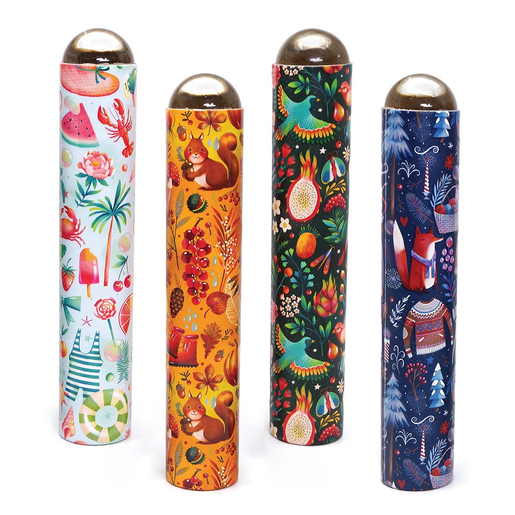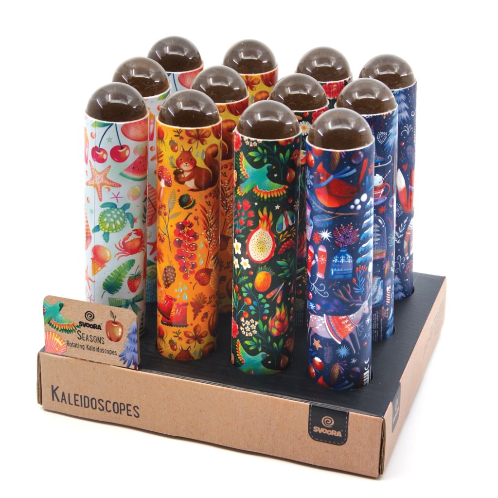 Stojan (19 × 21.5 × 19 cm) obsahuje 3 velké kaleidoskopy s křišťálovou koulí od každého vzoru: Letní, podzimní, jarní, zimní.