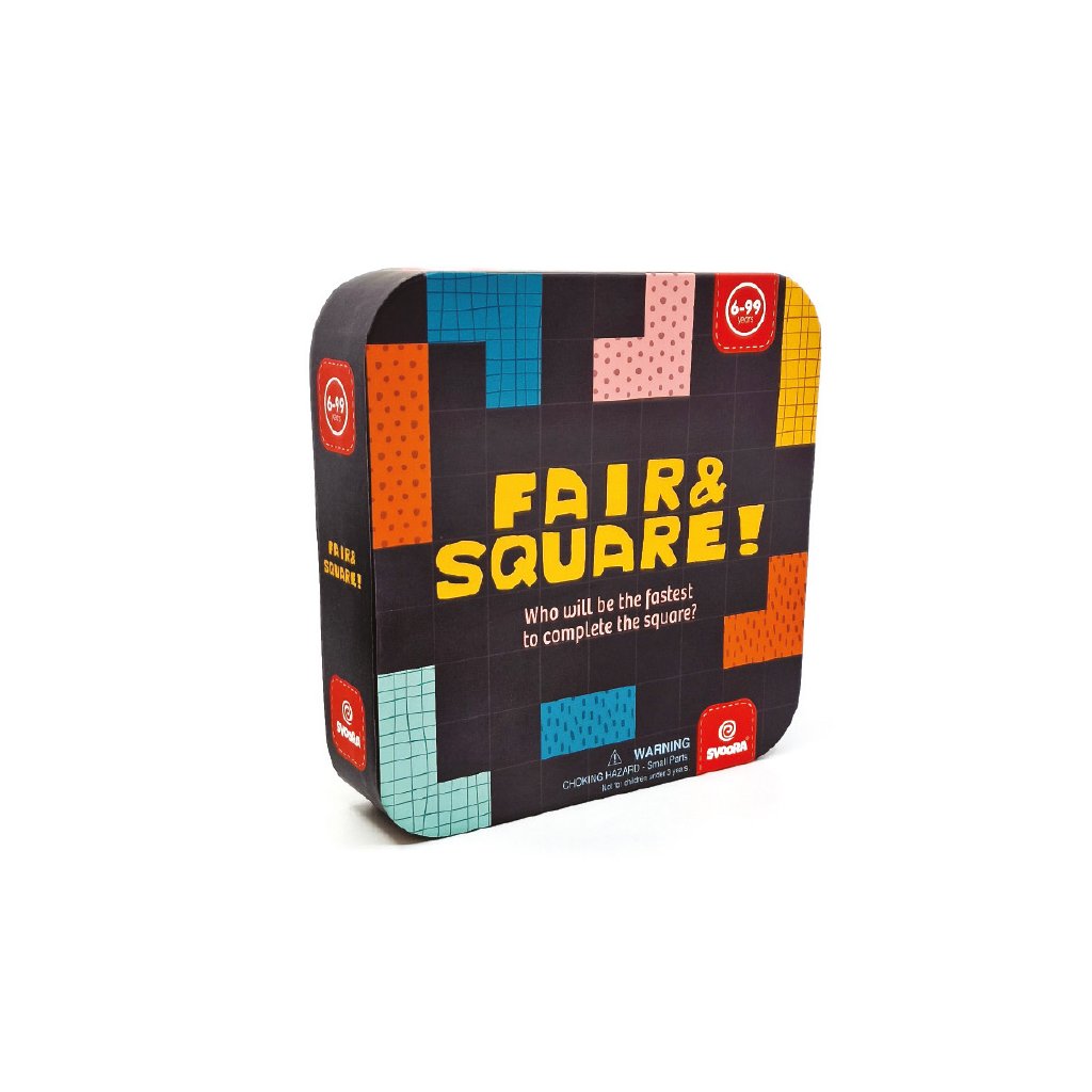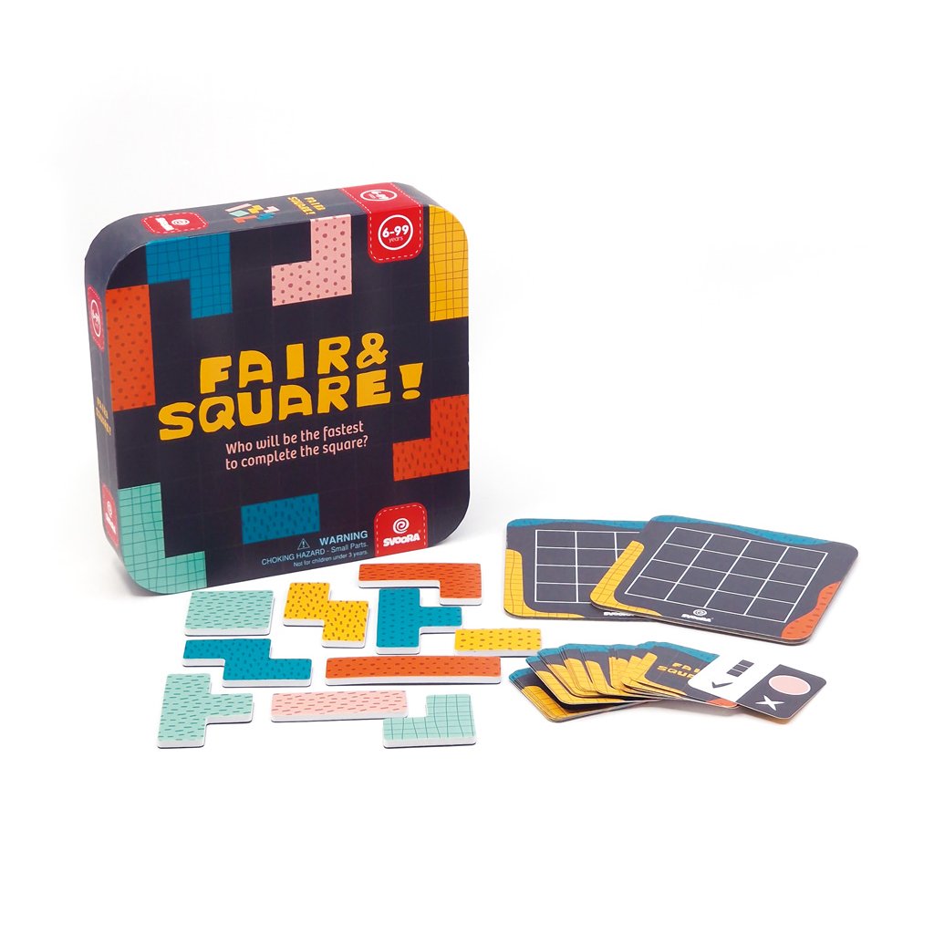V hře „Čestně a spravedlivě“ hráči postupně tahají karty, které určují, které dílky mají použít a kterým se mají vyhnout, a snaží se co nejrychleji zaplnit svou čtvercovou desku bez mezer.