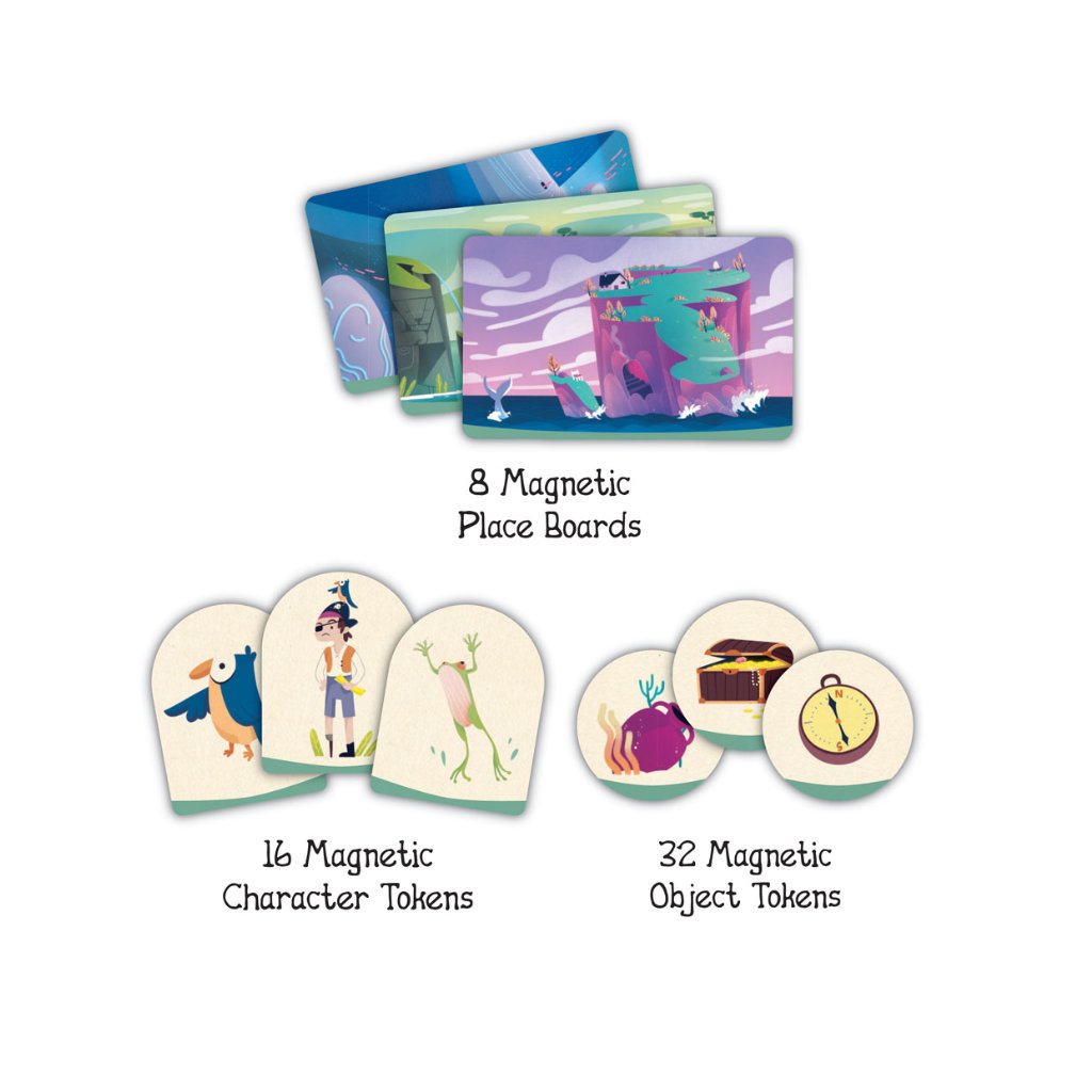 Součástí balení je mnoho magnetických žetonů, které je třeba náhodně vybrat a umístit na tyto 3 stránky. Na základě vyobrazených prvků lze vytvářet různé druhy zápletek a příběhů s nespočtem alternativních verzí! Možnosti příběhů jsou nekonečné!