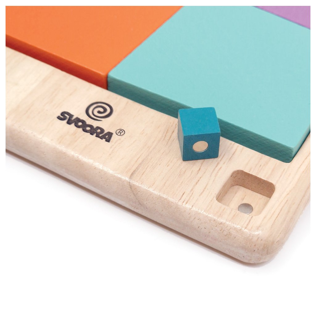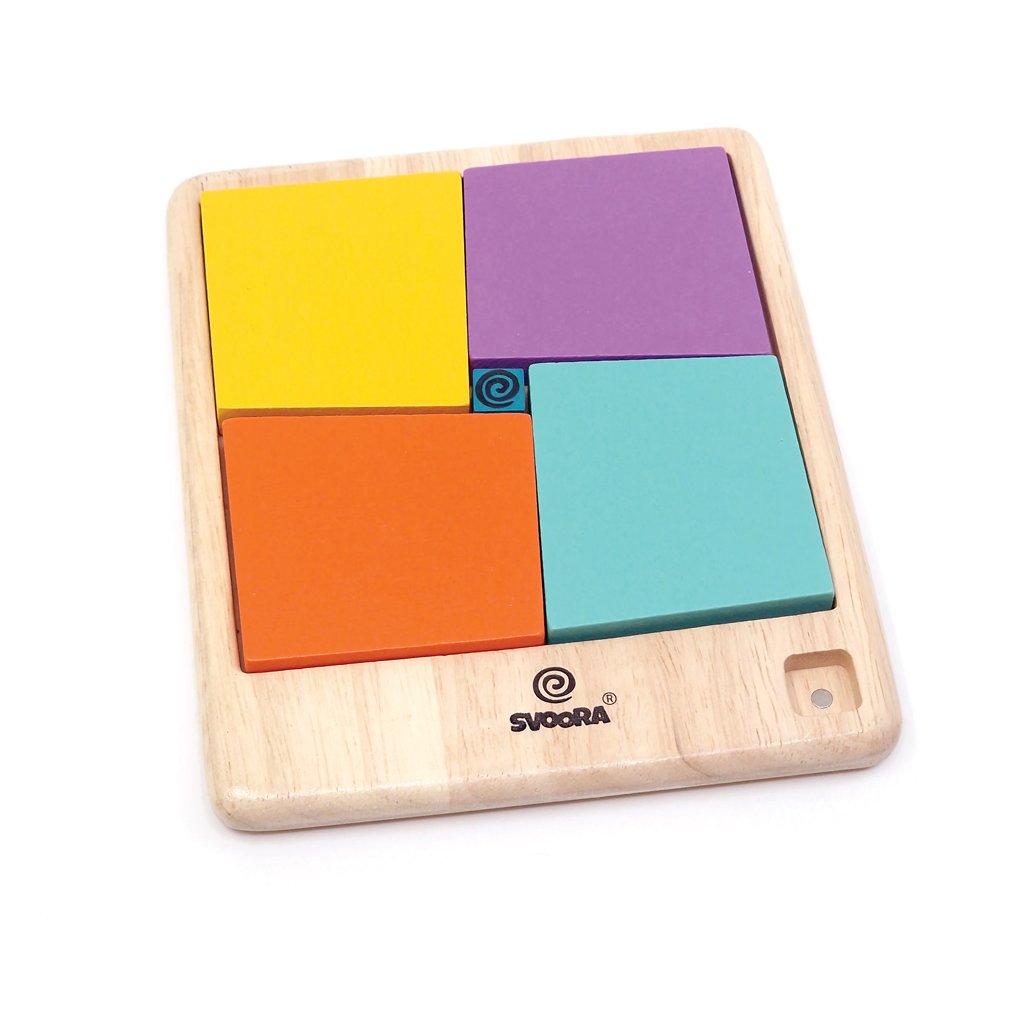 Tato skládačka obsahuje 5 dřevěných dílků – 4 velké a 1 malý –, které musí perfektně zapadnout do čtvercového rámu bez mezer a překrývání.